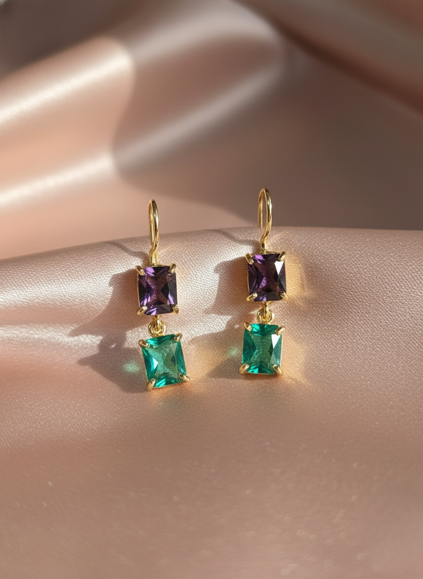 Add a bold and elegant touch to your look with these Mora Mora Emerald Amethyst Duo Drop Earrings,
