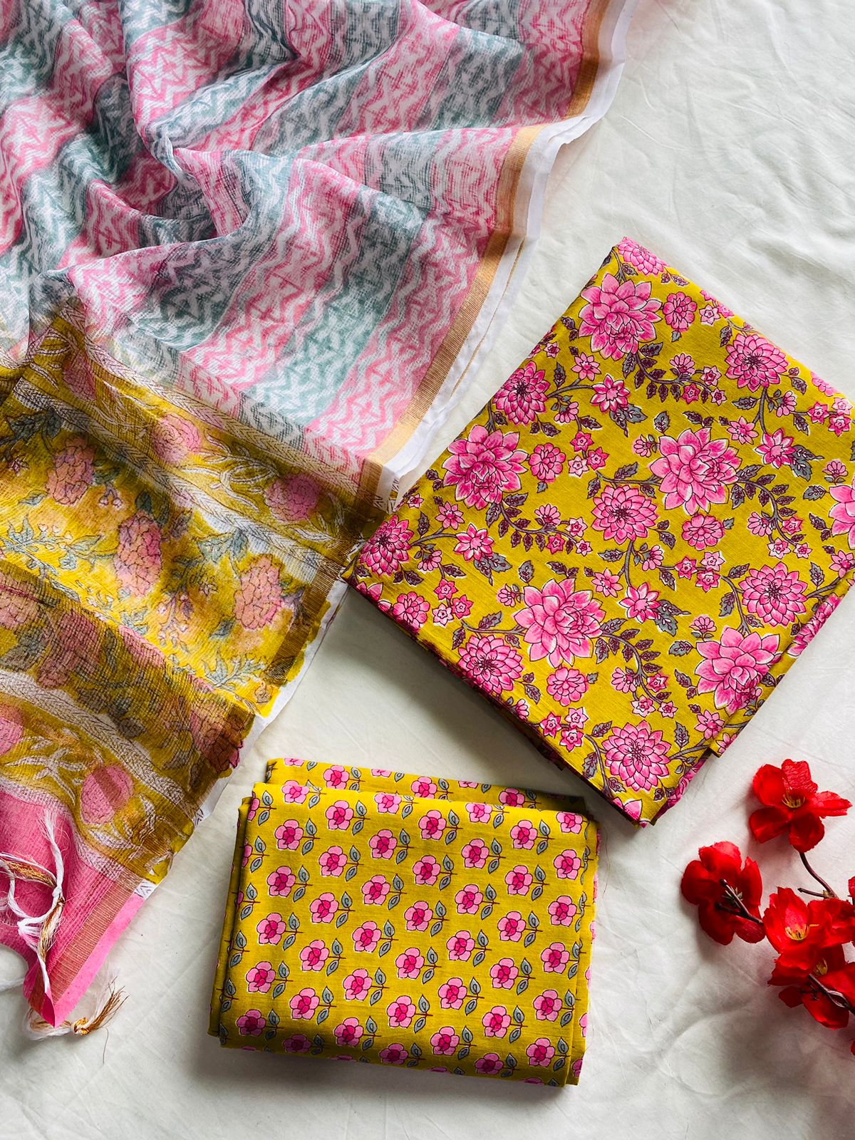 Be the first to review “Pushpika Pure Cotton Handblock Suit Set with Kota Doria Dupatta – Mustard Yellow & Pink Floral | Mora Mora”