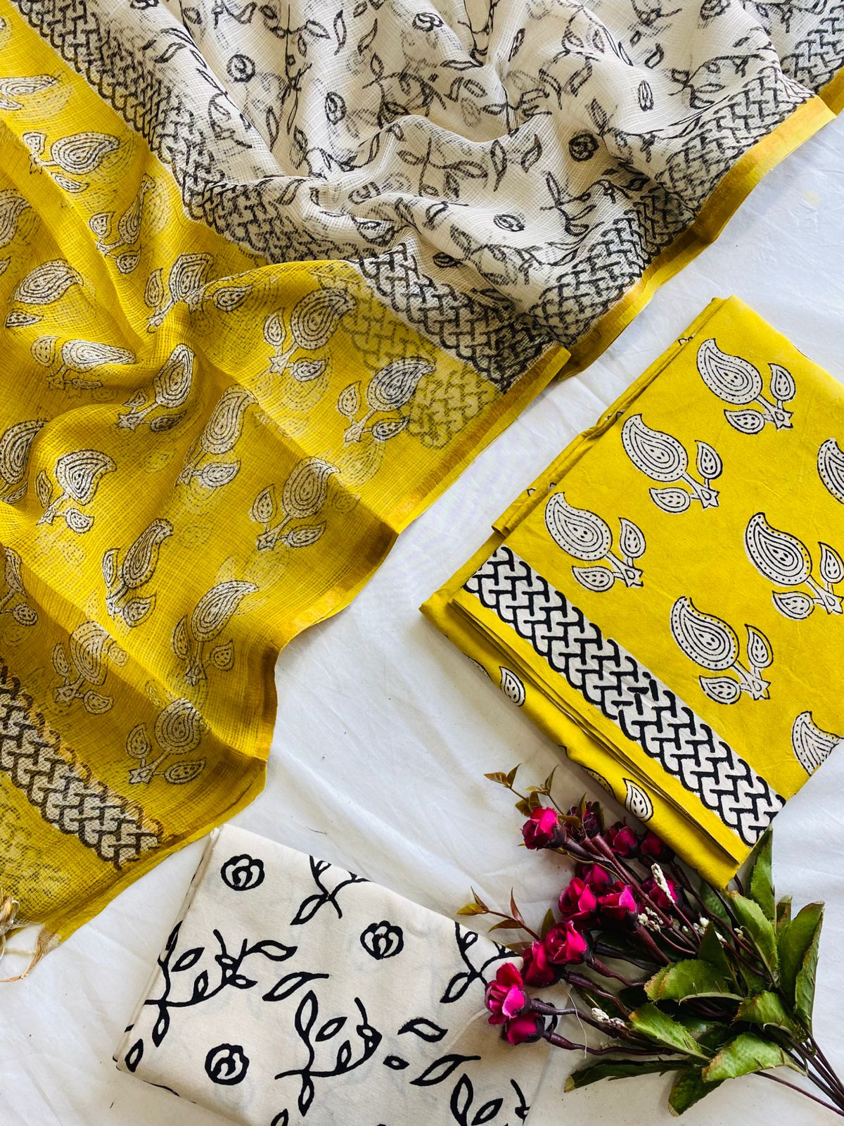 Be the first to review “Suryika Pure Cotton Handblock Suit Set with Kota Doria Dupatta – Yellow & Ivory | Mora Mora”